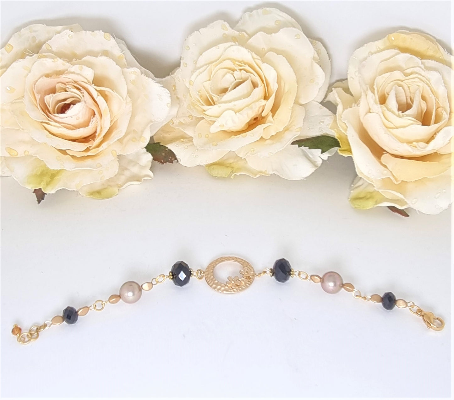Bracciale perle, cristalli, elementi metallo battuto tondo dorato. cm. 20-21.