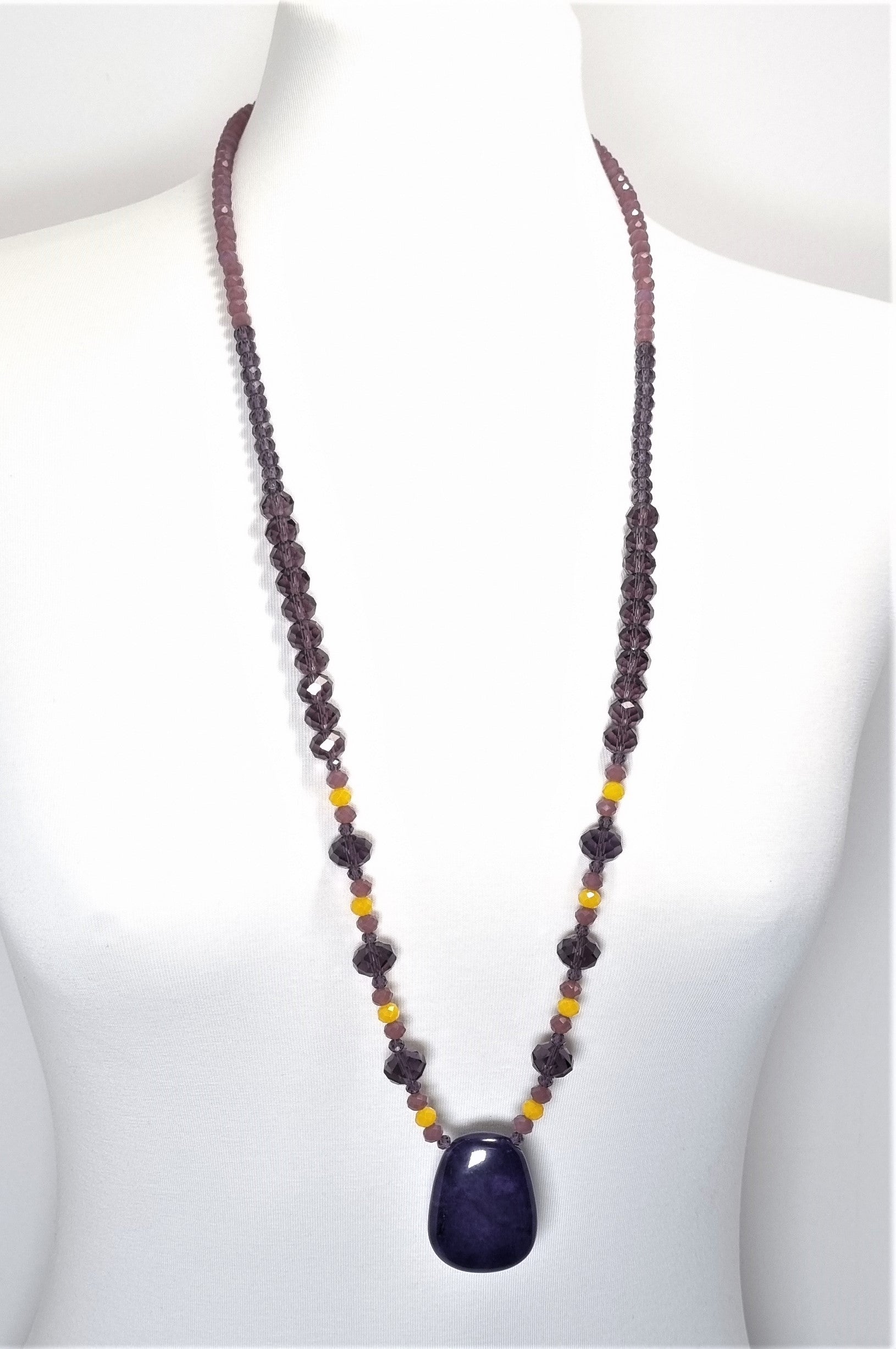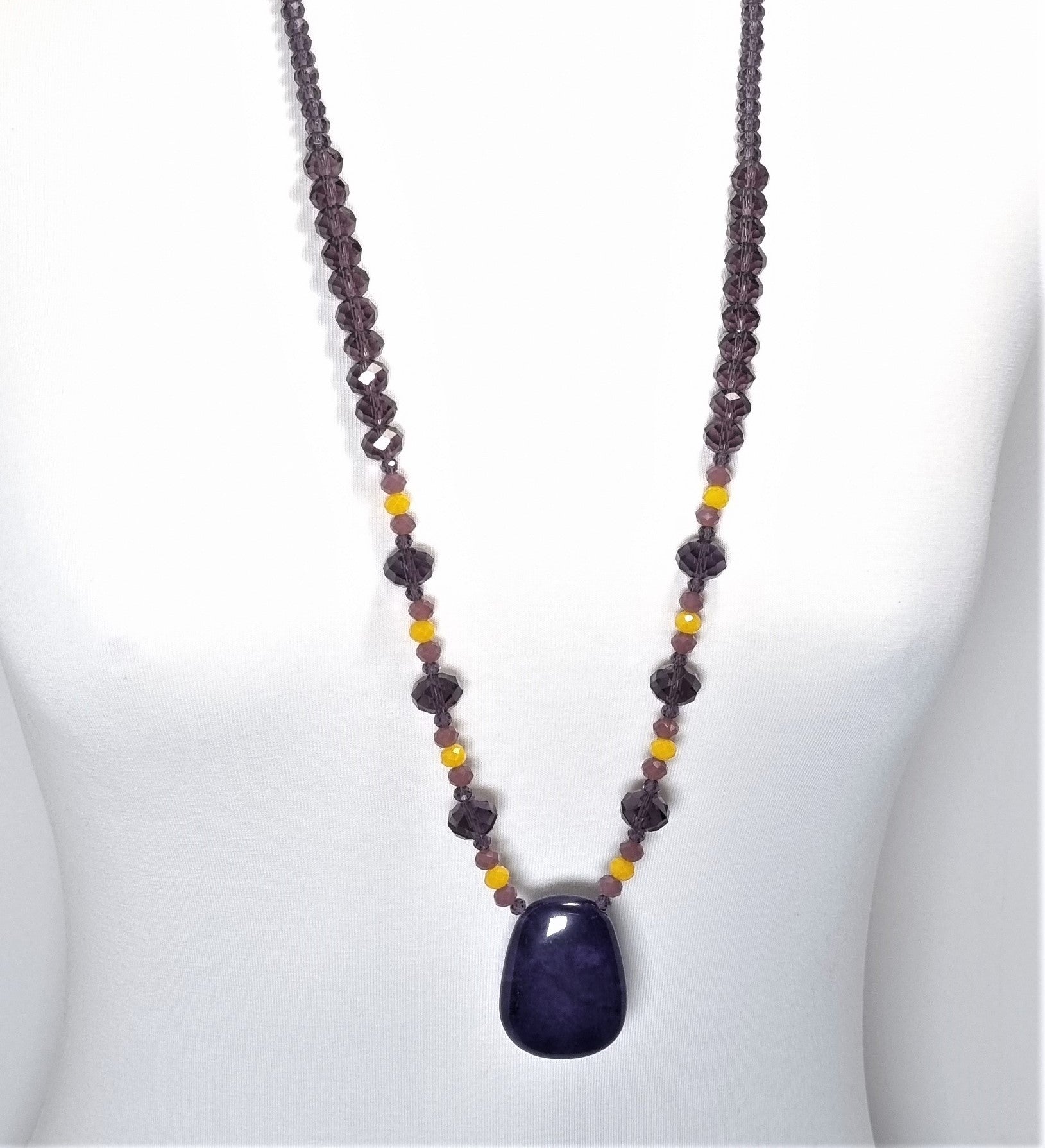 Collana un filo cristalli austriaci tre misure, viola, giallo, malva ciondolo ametista. fashion.