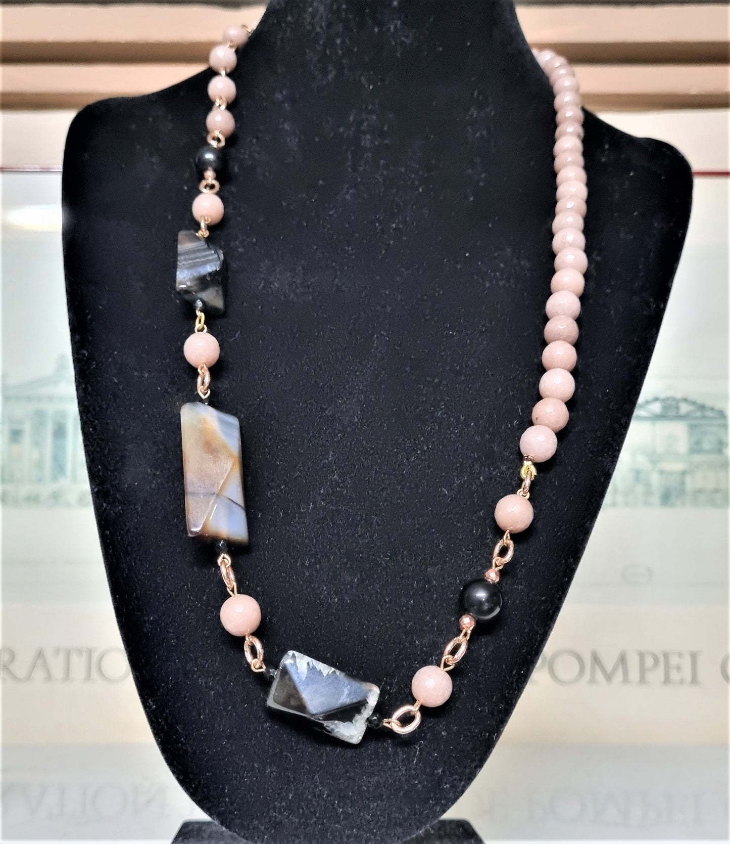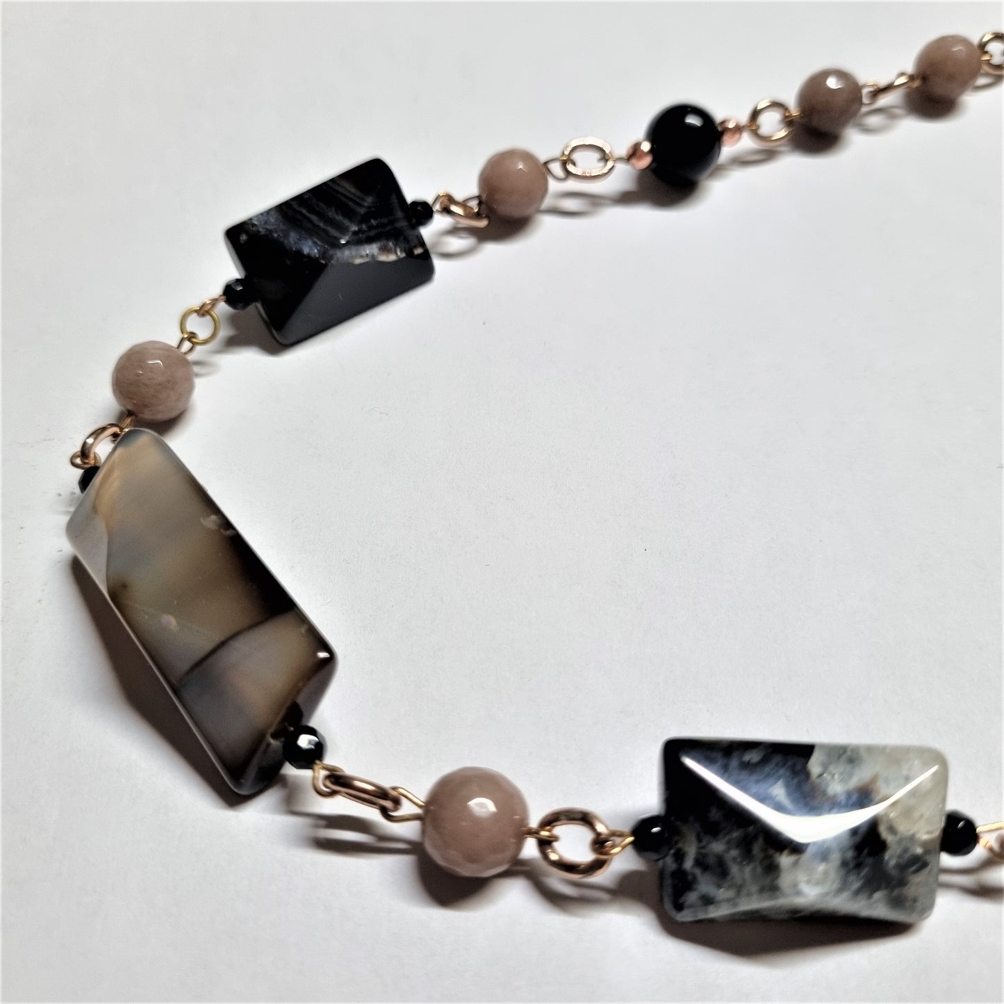 Collana un filo di perle agata tortora e pietre di forma doppia piramide, perle di onice e metallo.