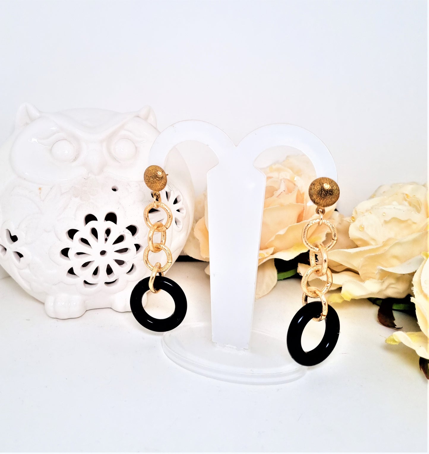 Orecchini maglie metallo dorato con maglia finale resina nera.