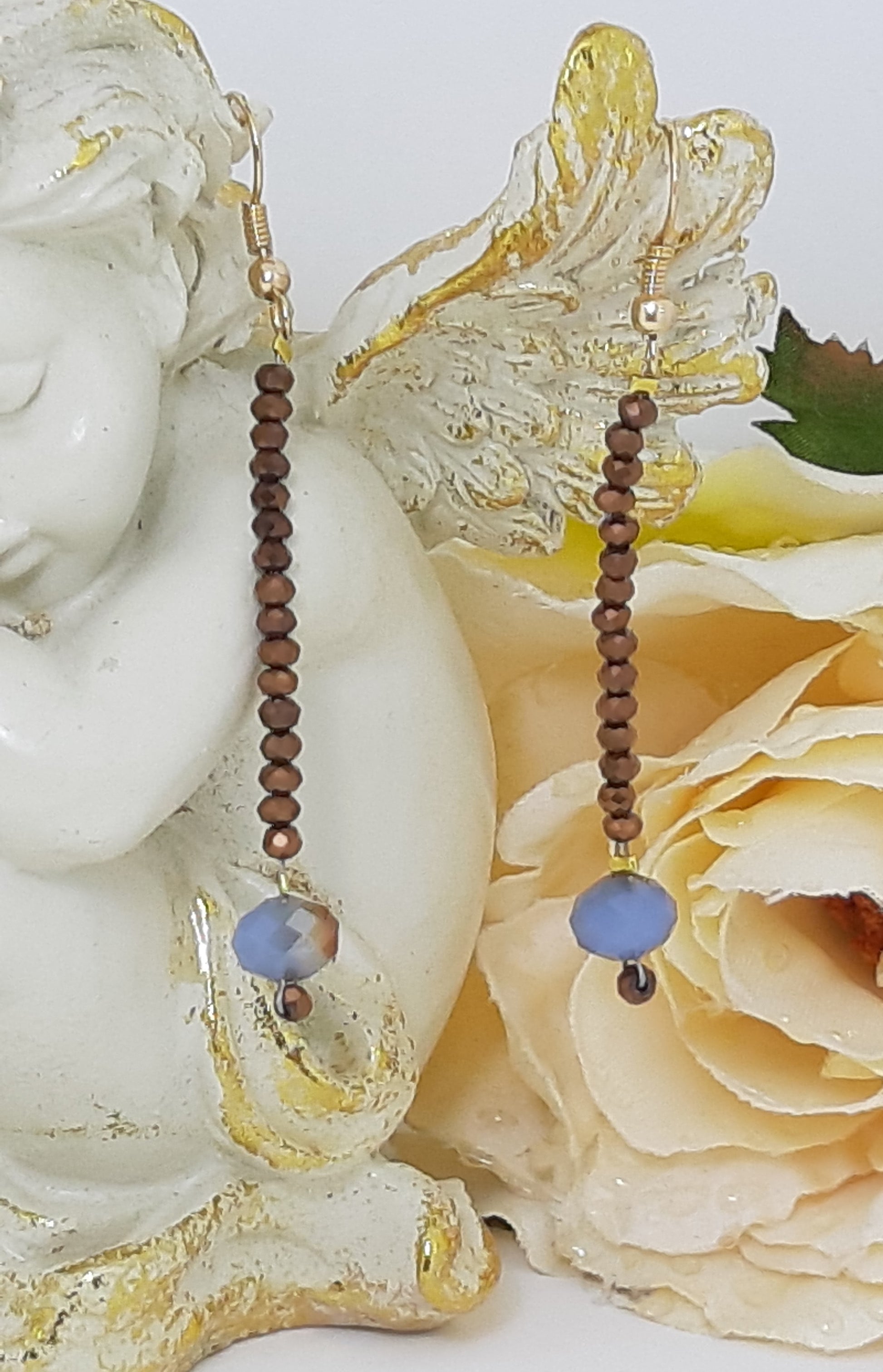 Orecchini filo piccolissimi cristalli bronzo monachella dorata e finale azzurro. Disponibile abbinamemento bracciali e collane.